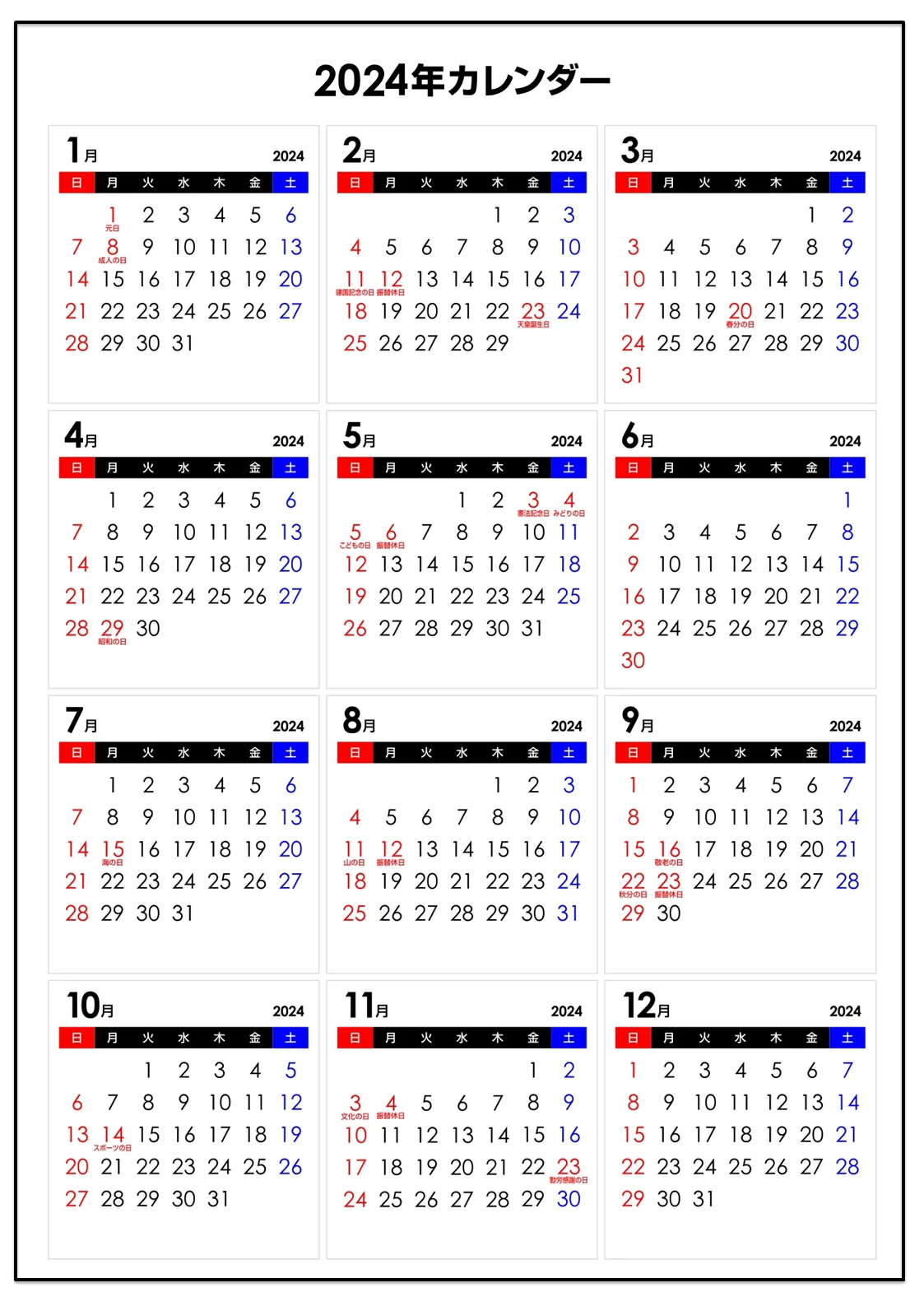 【 2024年の日本祝日】