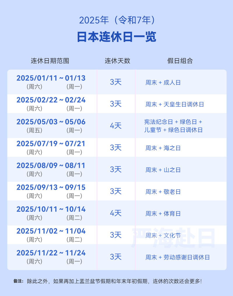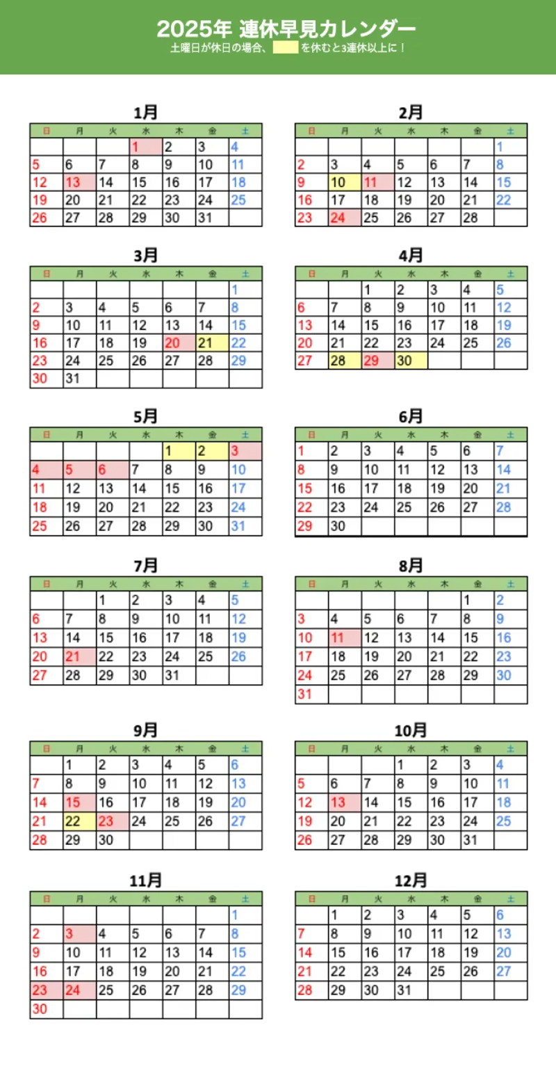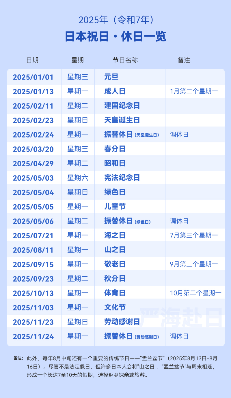 2025年日本紅日子日歷表(日本假期全年祝日完整版)