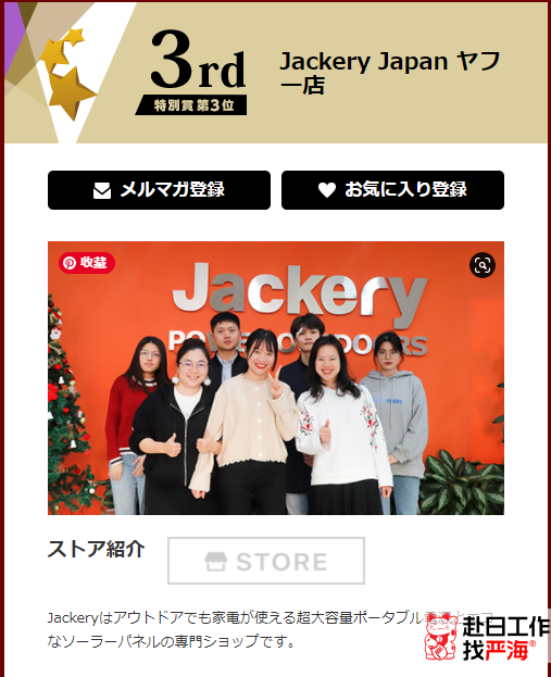 主營產品是可在戶外使用的超大容量便攜式電源和環保型太陽能電池板?!綣ackery Japan ヤフー店】可以說是所有獲獎店鋪中產品數量最少的店鋪了。整個店鋪總共12件產品。店鋪銷量第一的便攜式電源540條評論平均分4.83,銷量第二998條評論平均分4.81,可想而知【Jackery Japan ヤフー店】的產品是非常優秀了。在日本人眼中東西好只值3.5分,4.5分以上是產品超出預期的優秀了。