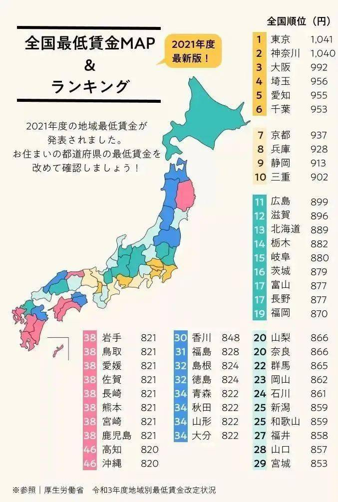 6、2021年10月起,日本47個(gè)都道府縣最低小時(shí)工資一覽表如下:
