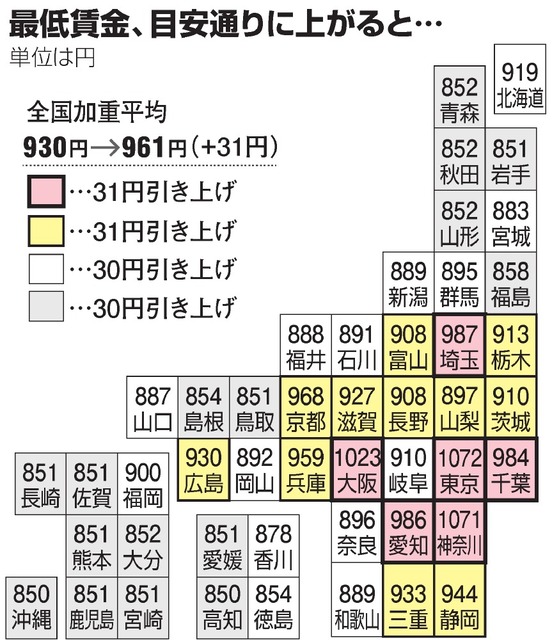 按照最新標(biāo)準(zhǔn),東京、神奈川、大阪、琦玉、愛知、千葉、京都、兵庫、靜岡、三重、廣島、滋賀、北海道、茨城、櫪木、岐阜的最低時(shí)薪都超過1,000日元。