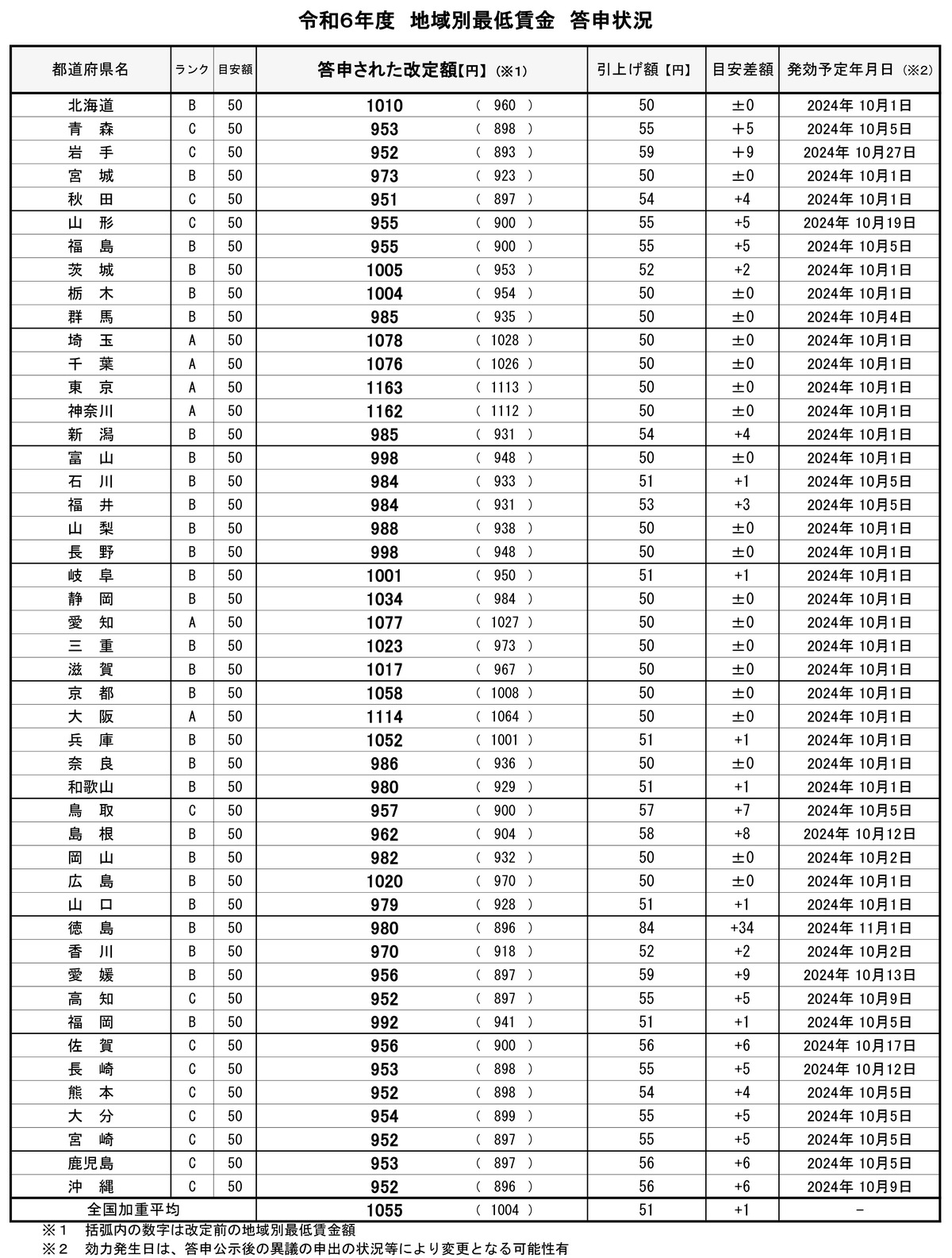 全國平均最低小時(shí)工資1054日元。(比去年的全國平均1052日元,增加了52日元)