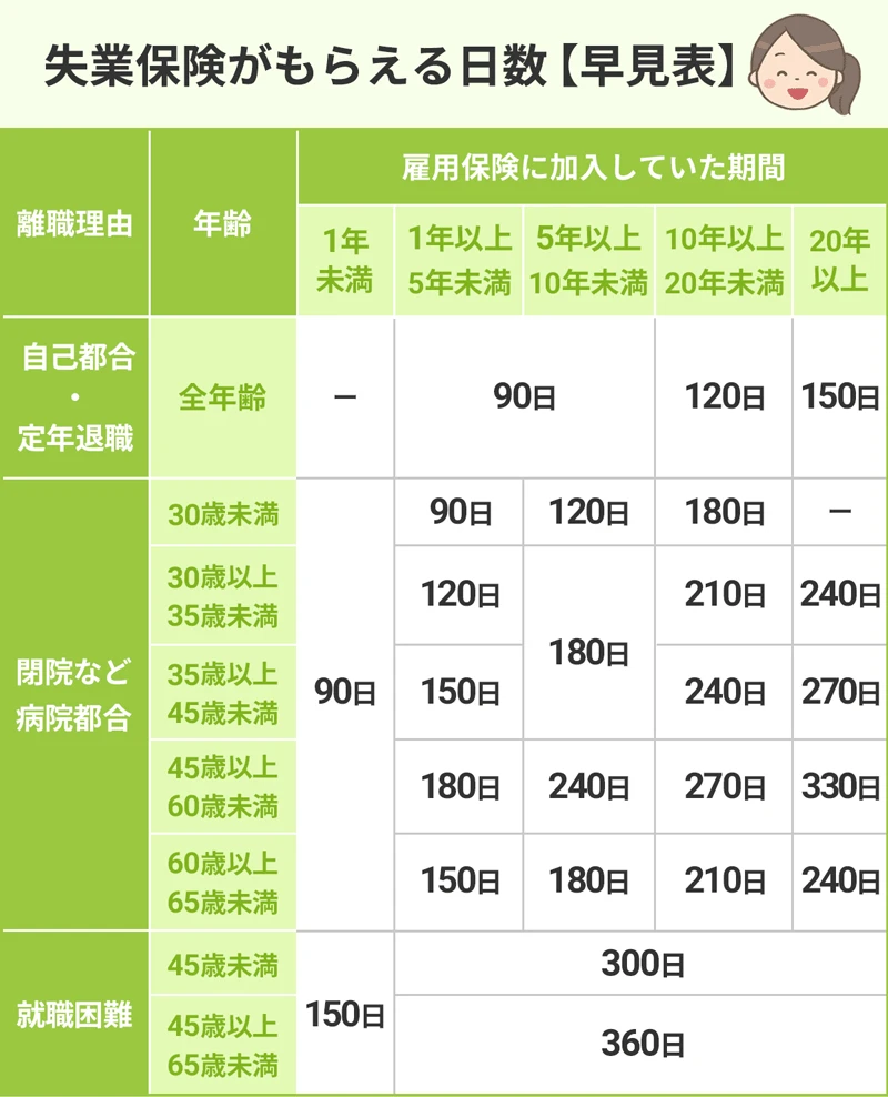具體的規(guī)定支付天數(shù)在90天~360天之內(nèi),由離職時的年齡、加入雇傭保險的期間、離職理由等決定。