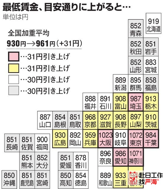全國平均最低小時(shí)工資961日元。(比去年的全國平均930日元,增加了31日元)
